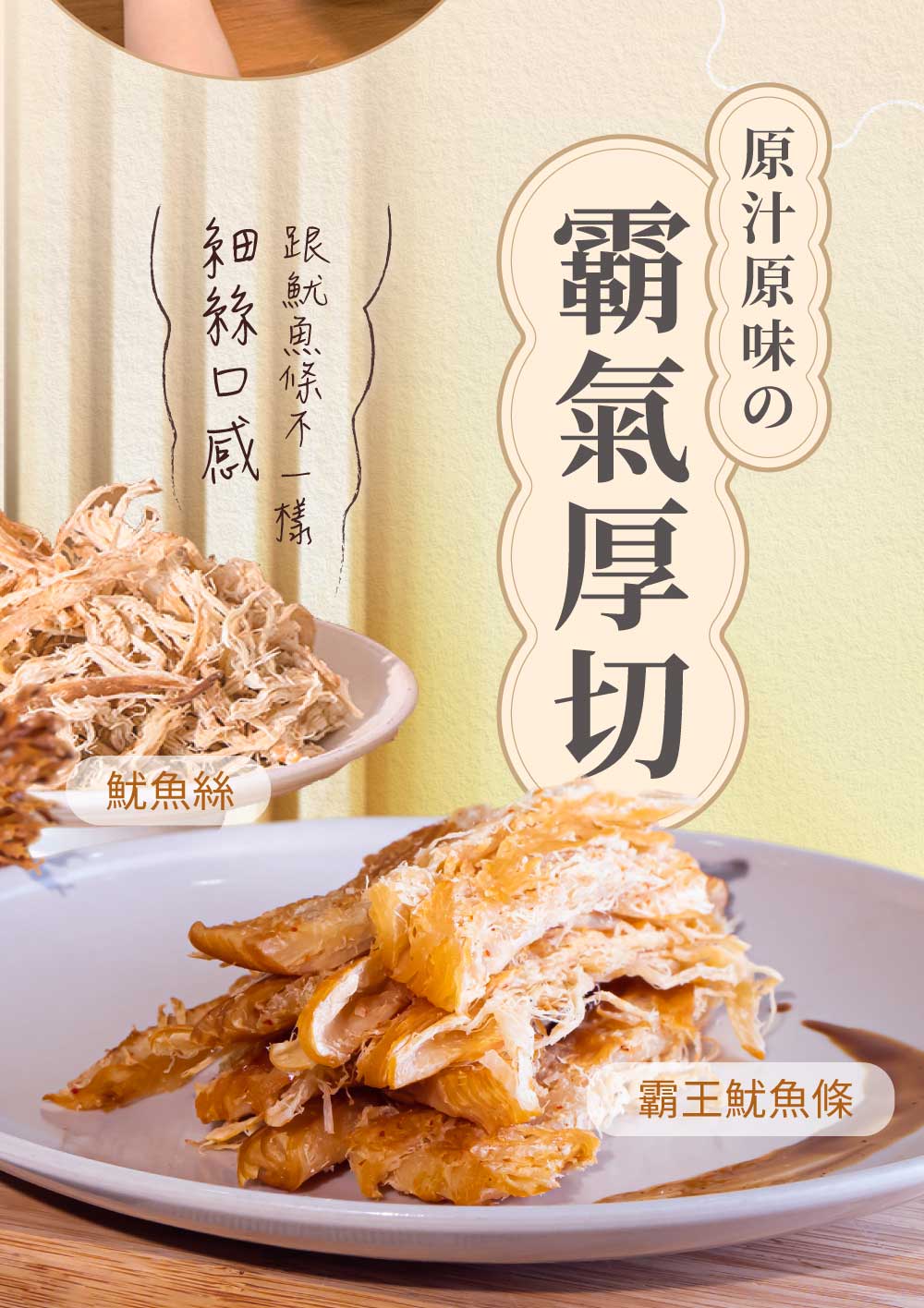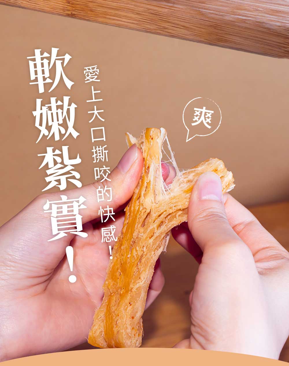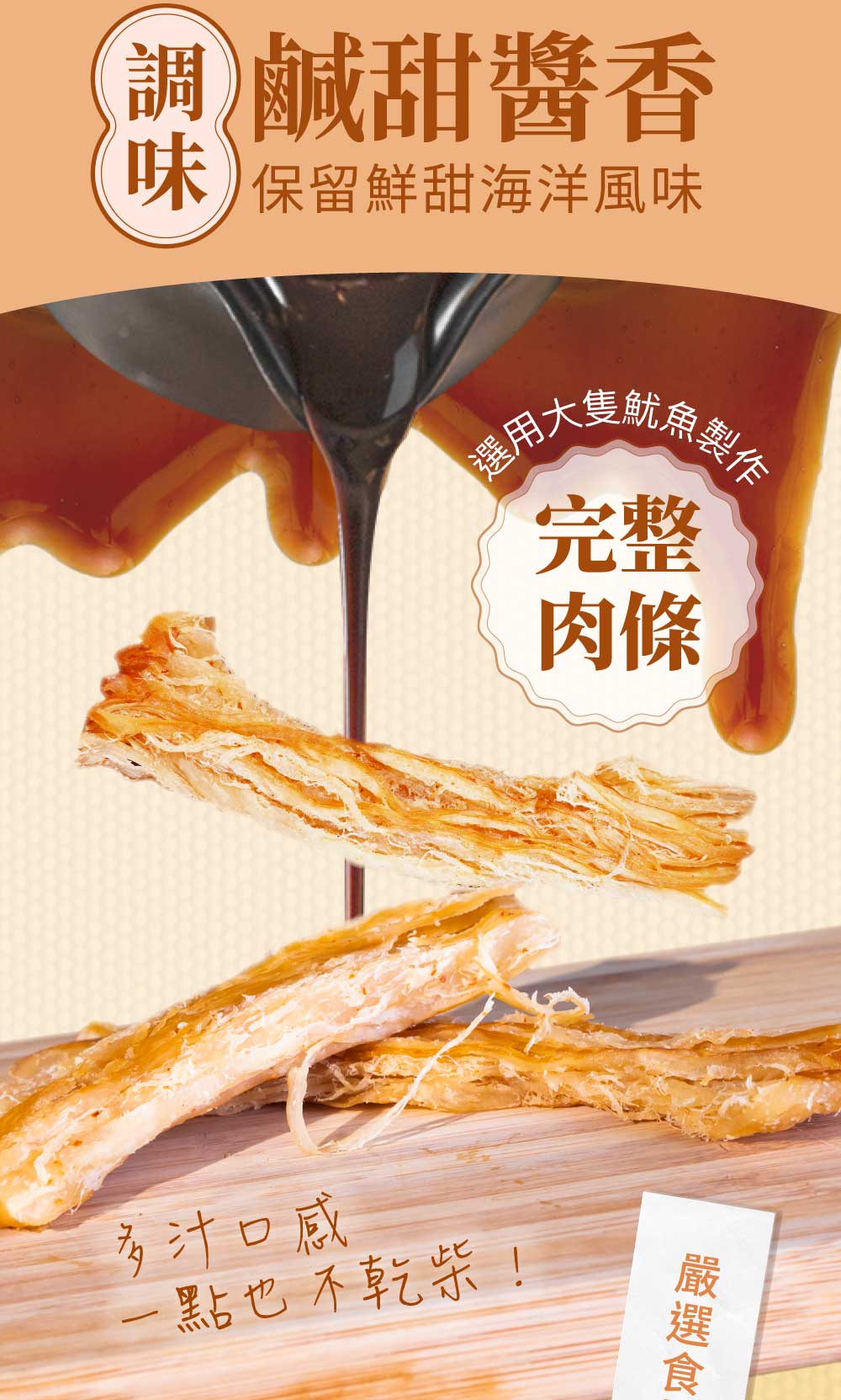 嚴選新鮮大隻魷魚製作,保留大塊的魷魚肉條,滿足你大口撕咬的快感!絕對有別於一般魷魚絲的口感喔~鹹香甜糯的口感,不管是大人、小孩都非常喜歡喔!你一定要嘗試看看!